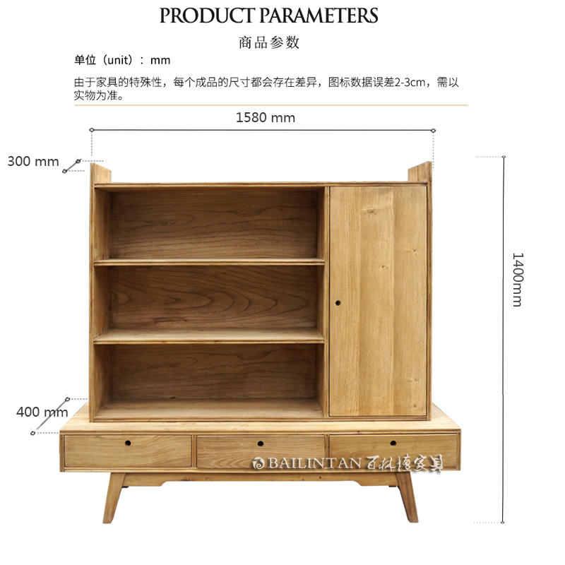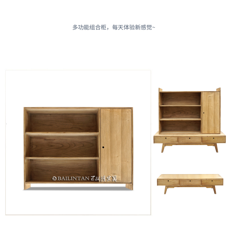 百林檀原木色实木电视柜组合架子书架多用设计师免漆榆木定制家具