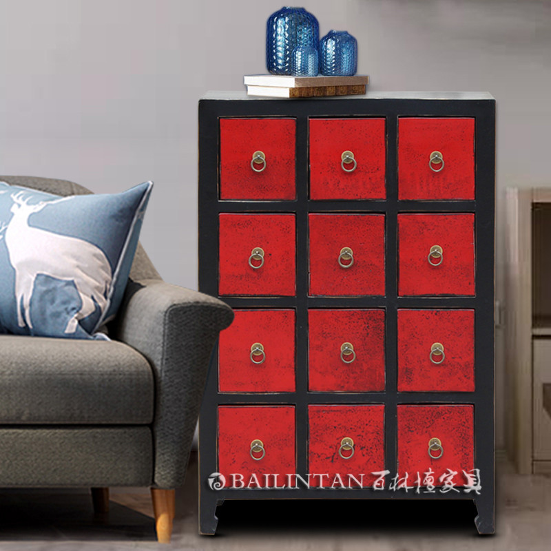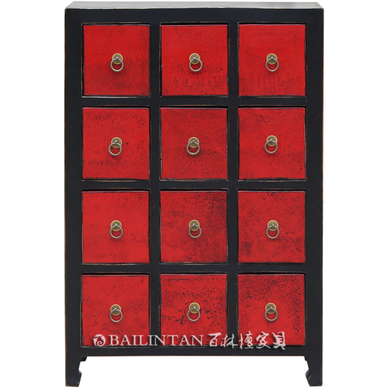 名称/ Description 红色12斗柜 型号/Model DG-H 规格 /Specifications 长650mm 宽320mm 高970mm 材质/Texture of material 榆木加板材 铜配件 工艺/Crafsmanship 榫卯工艺 手绘漆画 颜色/Color 红色 可定做各种颜色 用途/Usage 斗柜 CD柜 边角柜 储物柜 特点/Characteristic 手工制作,榫卯结构,可以按您喜欢上漆各种彩色效果,常年出口家具,让您放心的家具