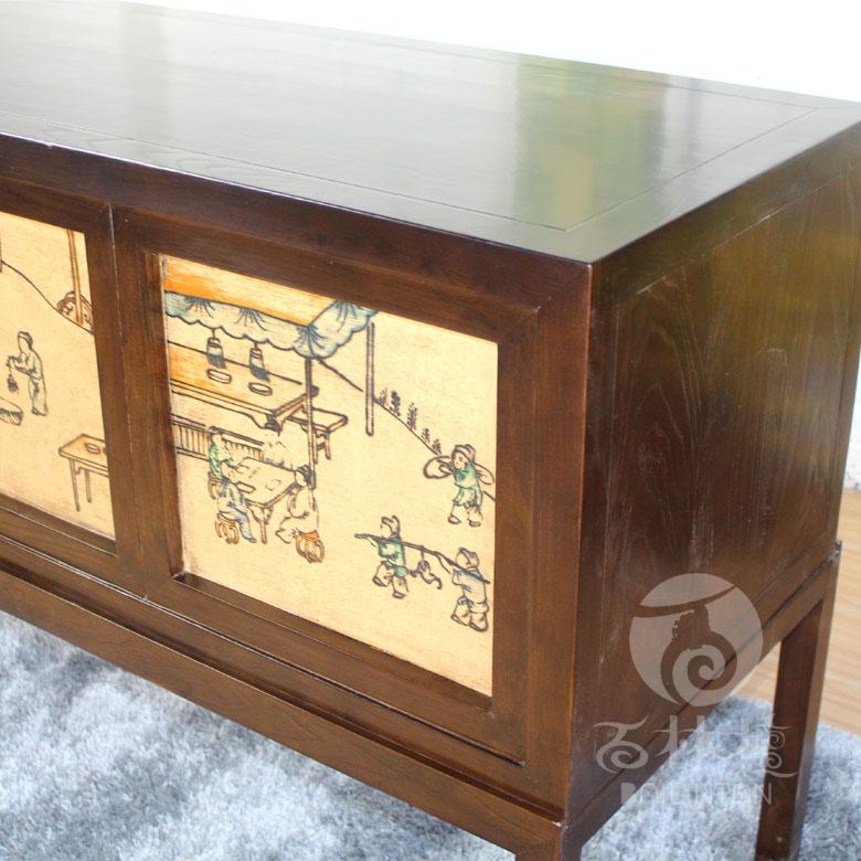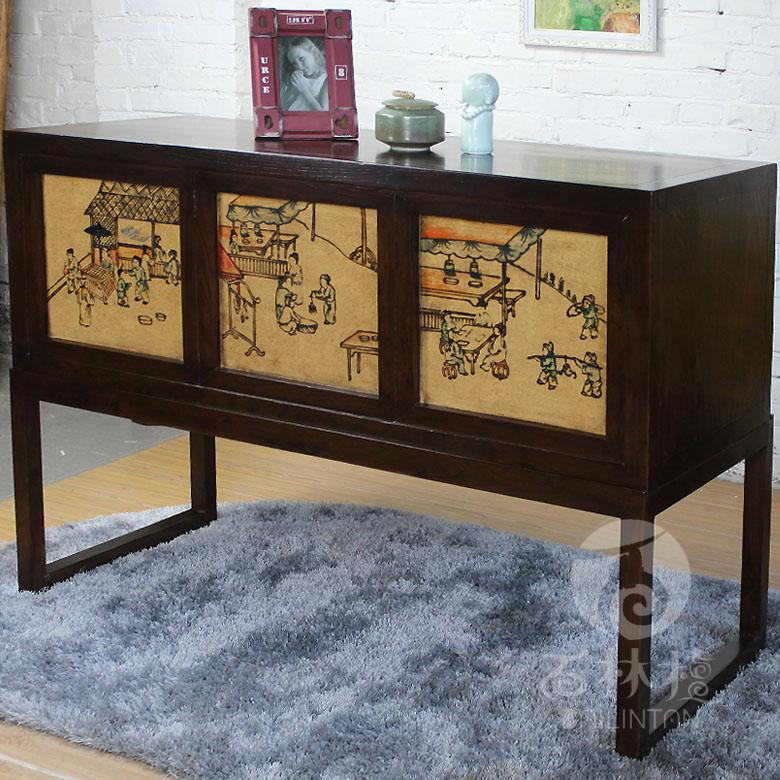 名称/ Description 手工彩绘古代人物漆画玄关台 型号/Model XXT182 规格 /Specifications 长1350mm 宽550mm 高900mm 材质/Texture of material 北方松木 板材 铜配件 工艺/Crafsmanship 榫卯工艺 手绘漆画 颜色/Color 深木色 可定做各种颜色 用途/Usage 玄关台 玄关柜 边角柜 储物柜