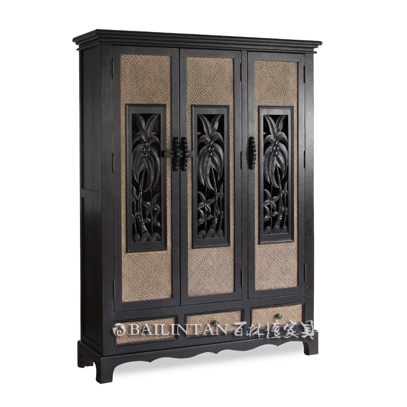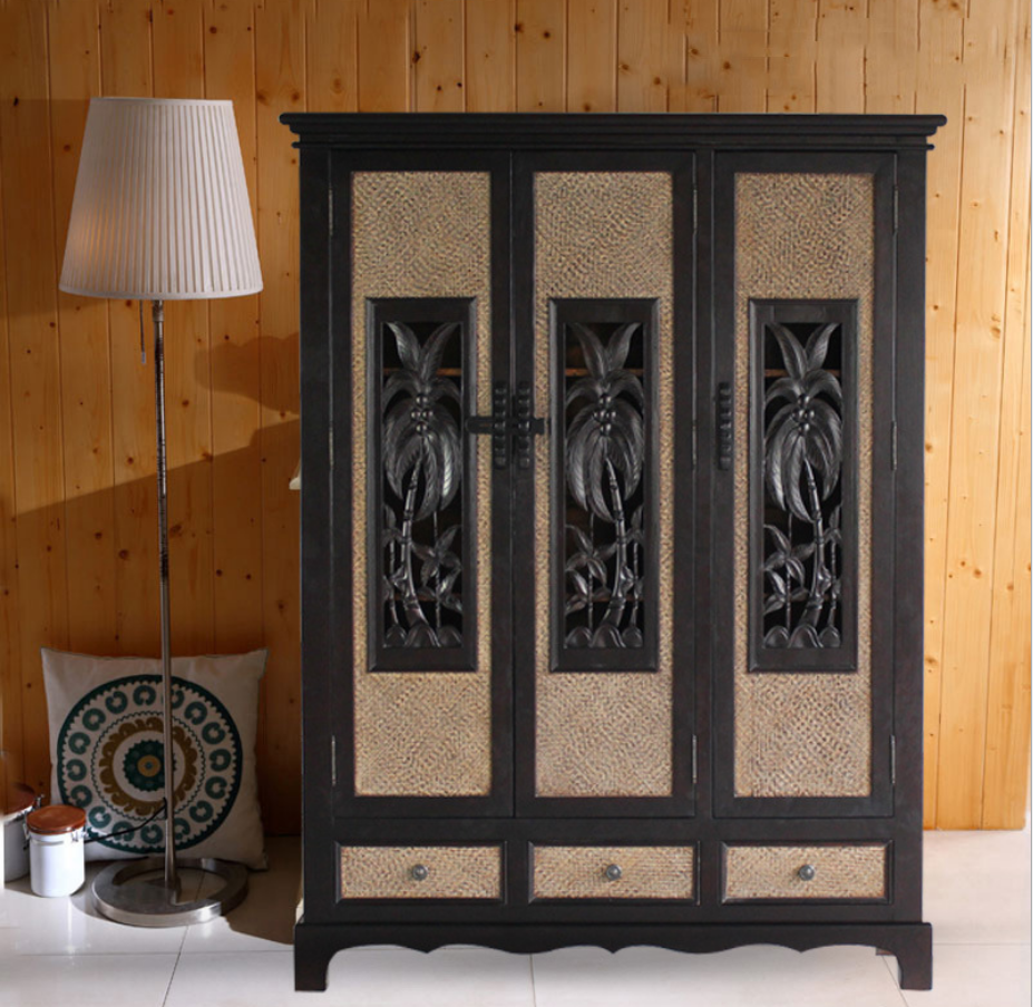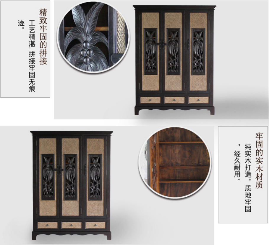 名称/ Description 东南亚整体实木大衣柜 型号/Model YG362 规格 /Specifications 长1500mm 宽450mm 高2000mm 材质/Texture of material 老杨木 (甘肃老杨木)铜配件 工艺/Crafsmanship 榫卯工艺 手工雕刻 颜色/Color 棕色做旧 可定做各种颜色 用途/Usage 衣柜 衣橱柜 大衣柜 边角柜 储物柜