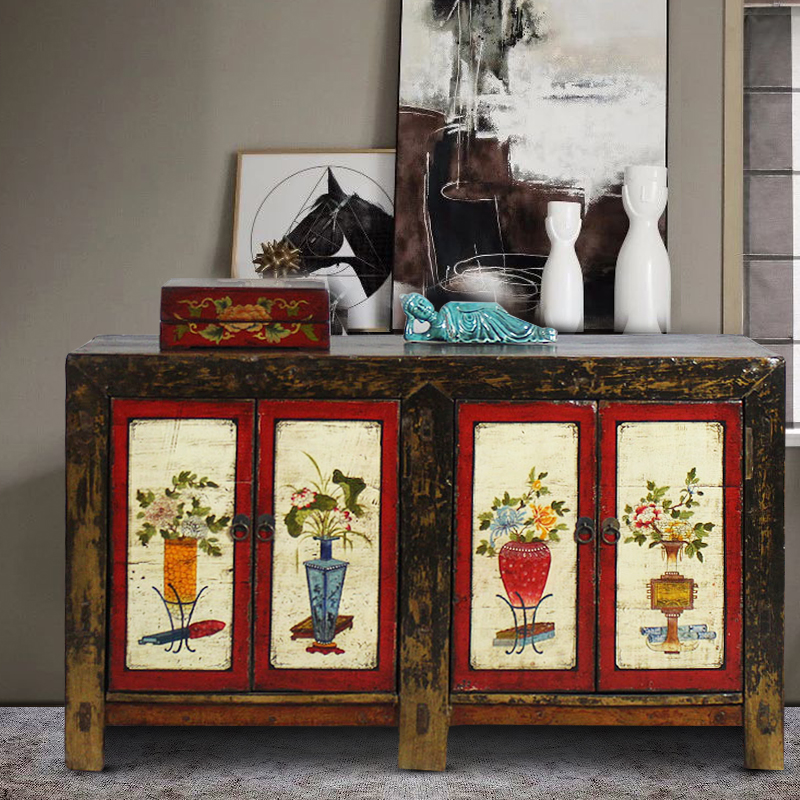 彩绘餐边柜实木做旧 老松木甘肃柜