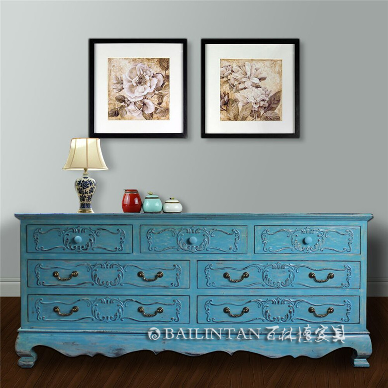 欧式雕花电视柜实木 复古做旧7斗斗柜抽屉柜 蓝色客厅柜子落地柜