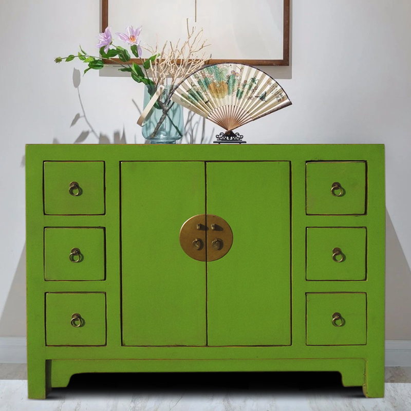 彩绘青花电视柜实木 榫卯6屉2门矮柜地柜 明清古典复古做旧柜家具