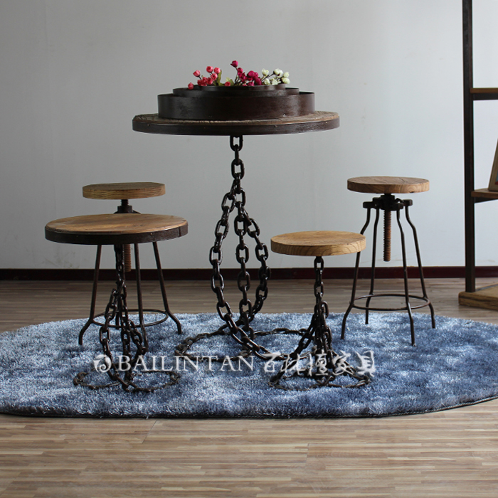 老榆木面铁艺小圆桌餐桌 旋转凳子套装5件 北欧铁链腿餐桌椅家具